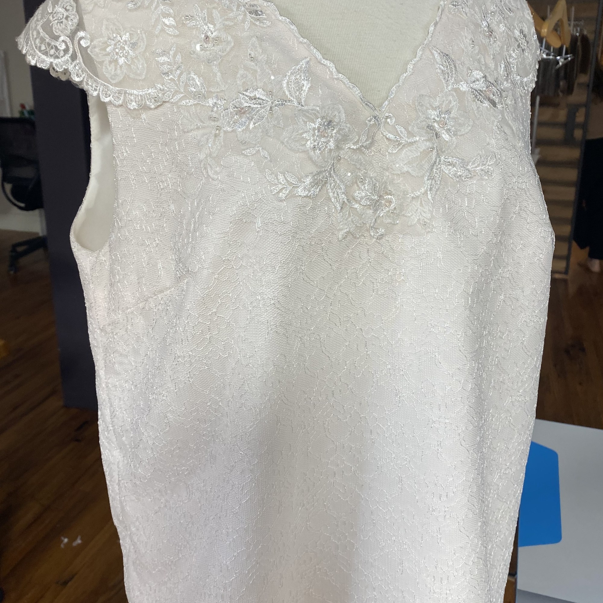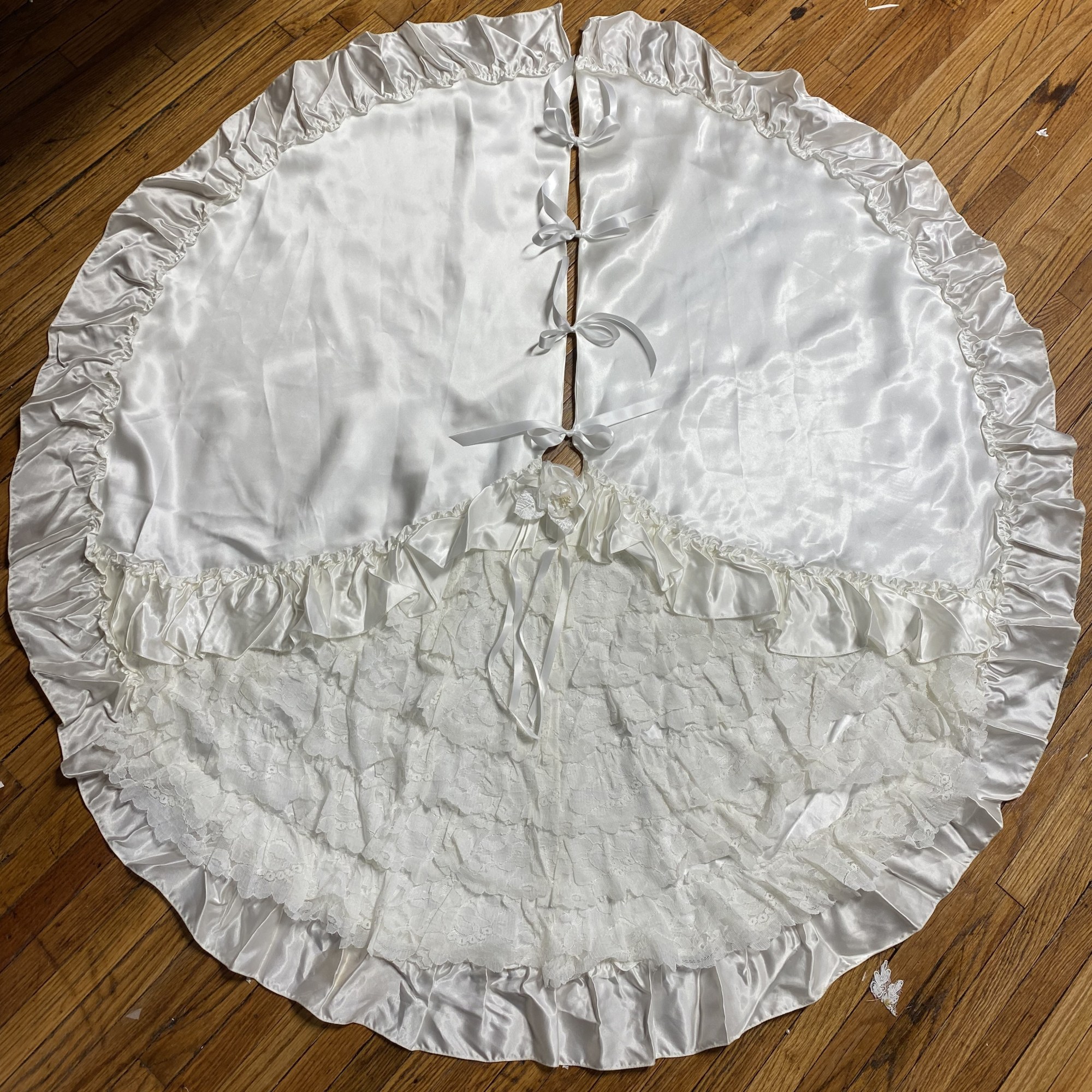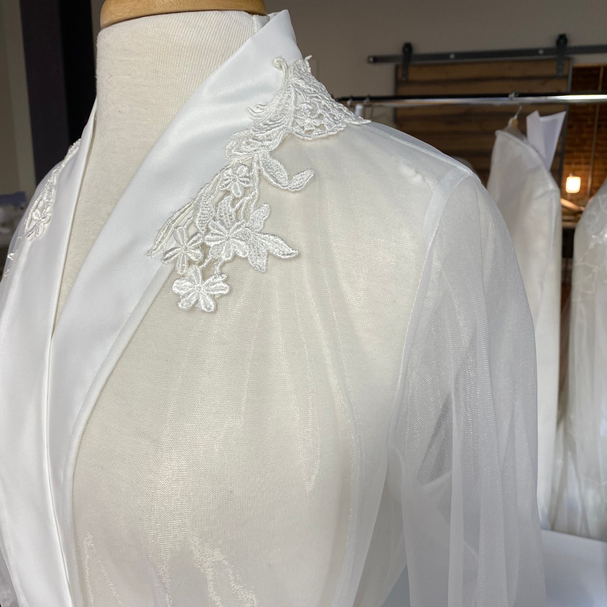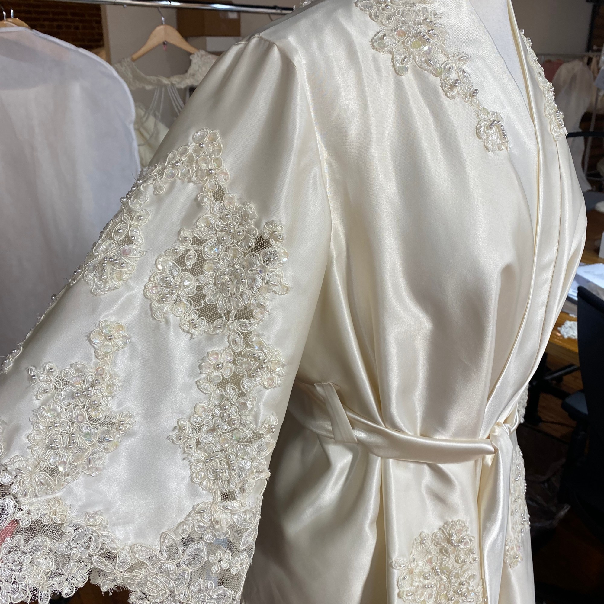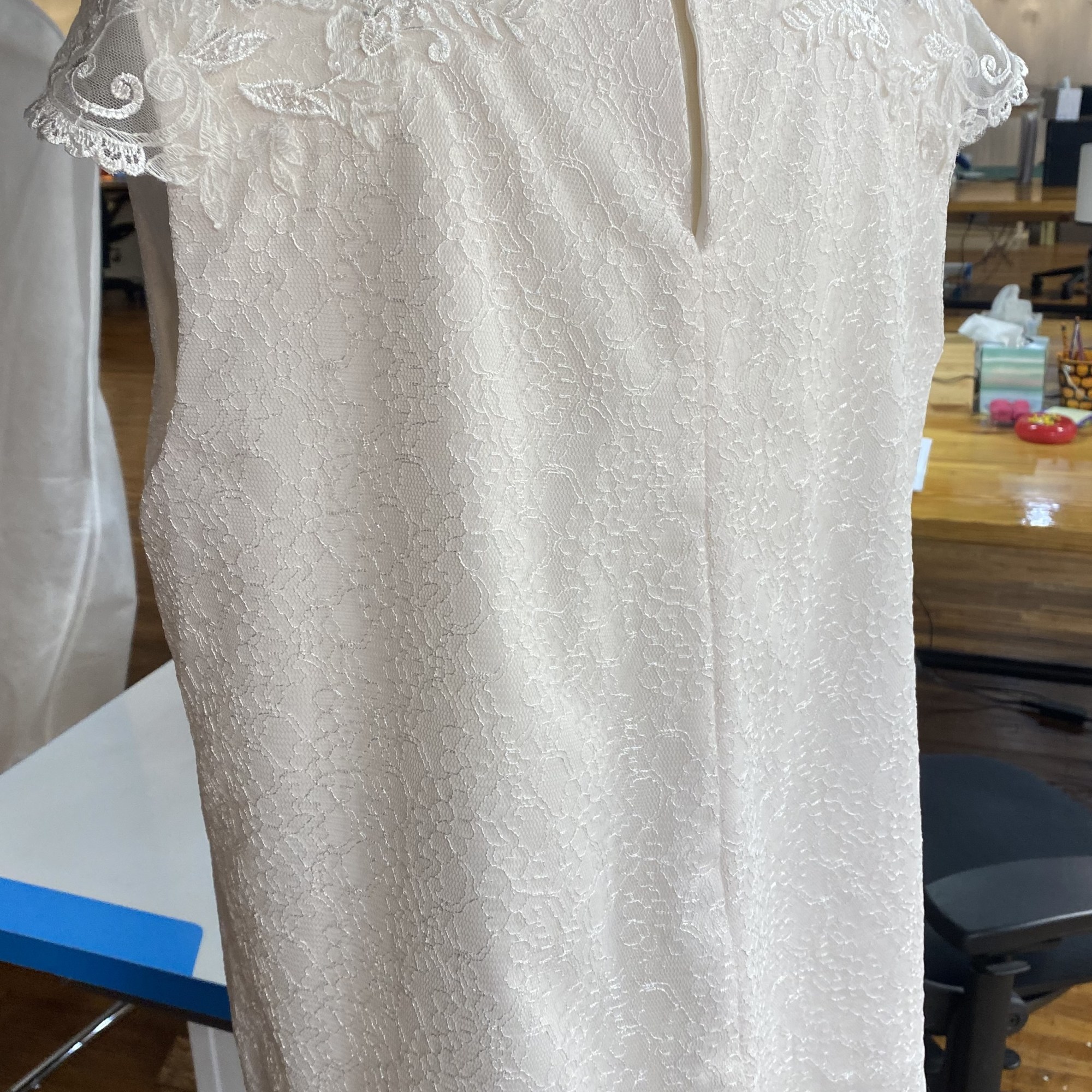 While employed at Unbox the Dress in NC i was tasked with constructing Wedding heirlooms by repurposing vintage wedding dresses. I also developed a pattern for a infant boys onesie with Velcro back opening. Most items are made use preexisting dresses made of satin and polyester blend materials. Lace detials were carefully removed from existing dresses and either hand or machine sewn back on to items.
