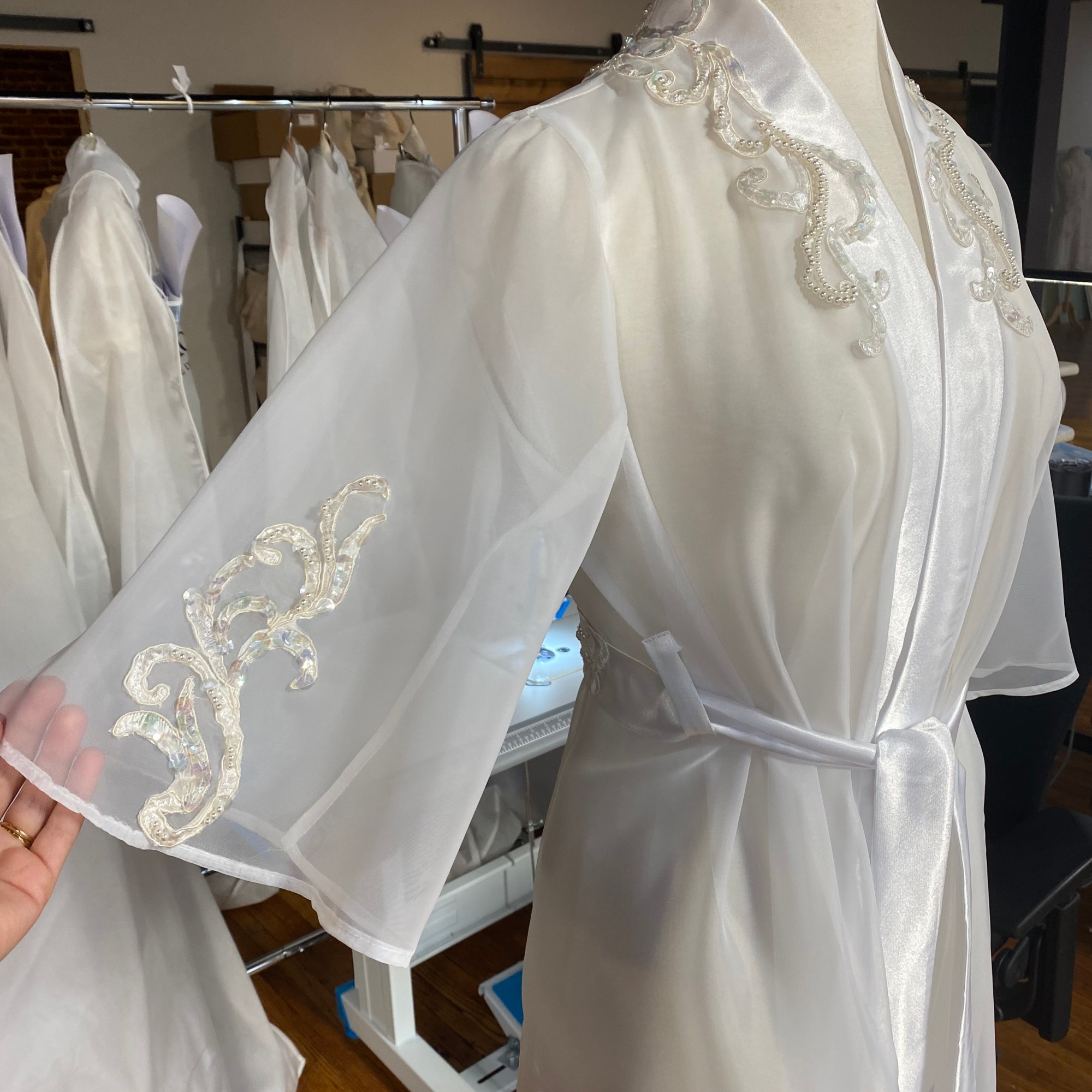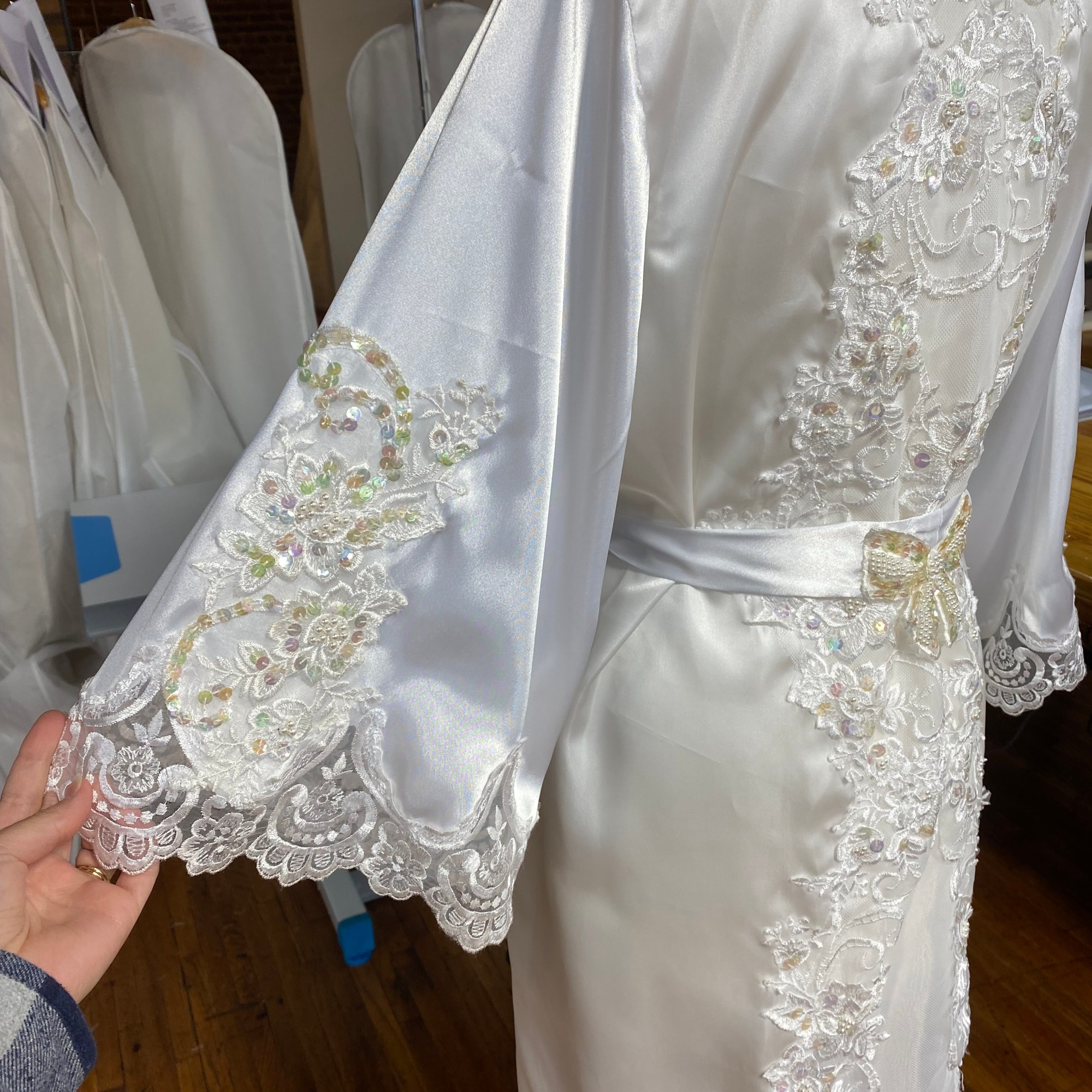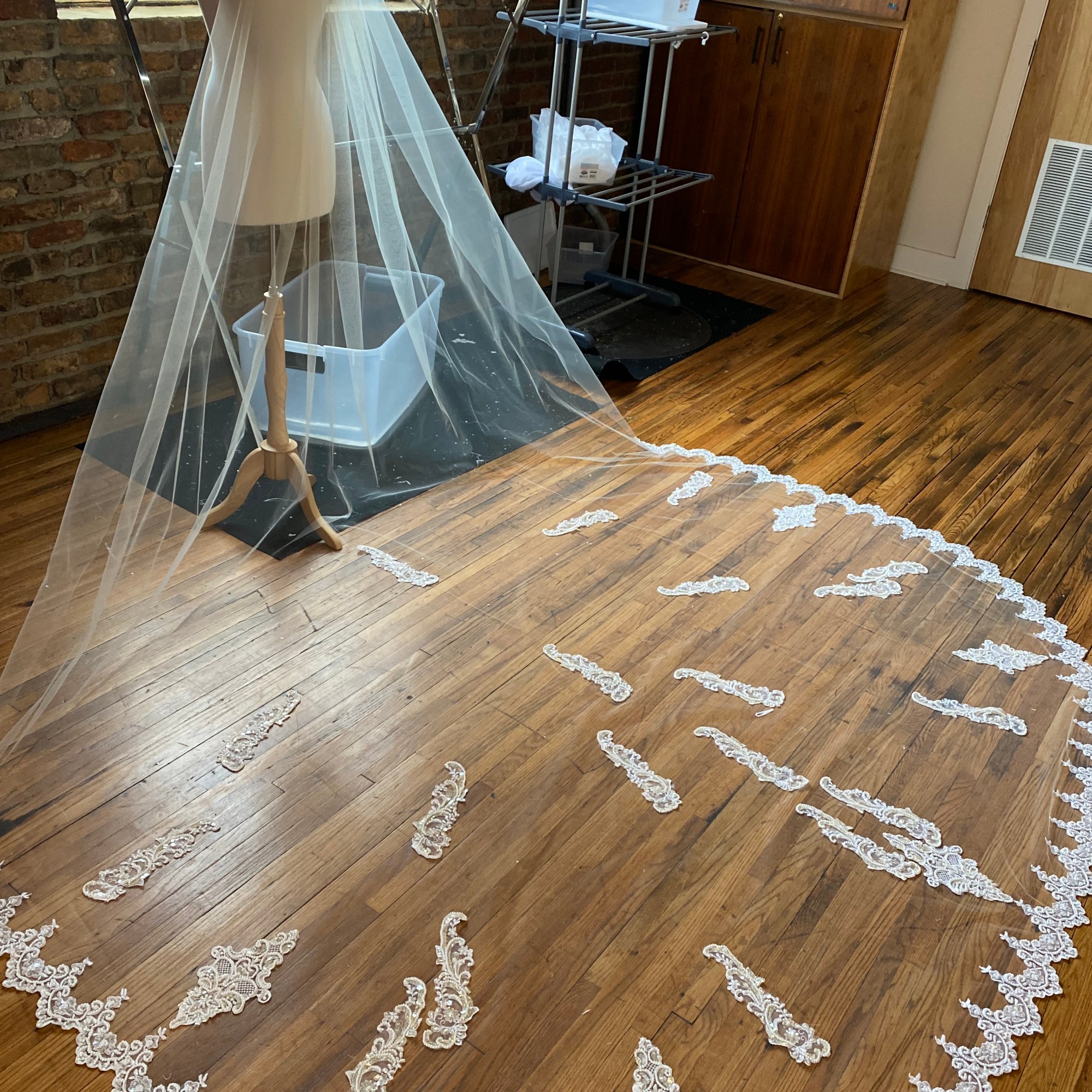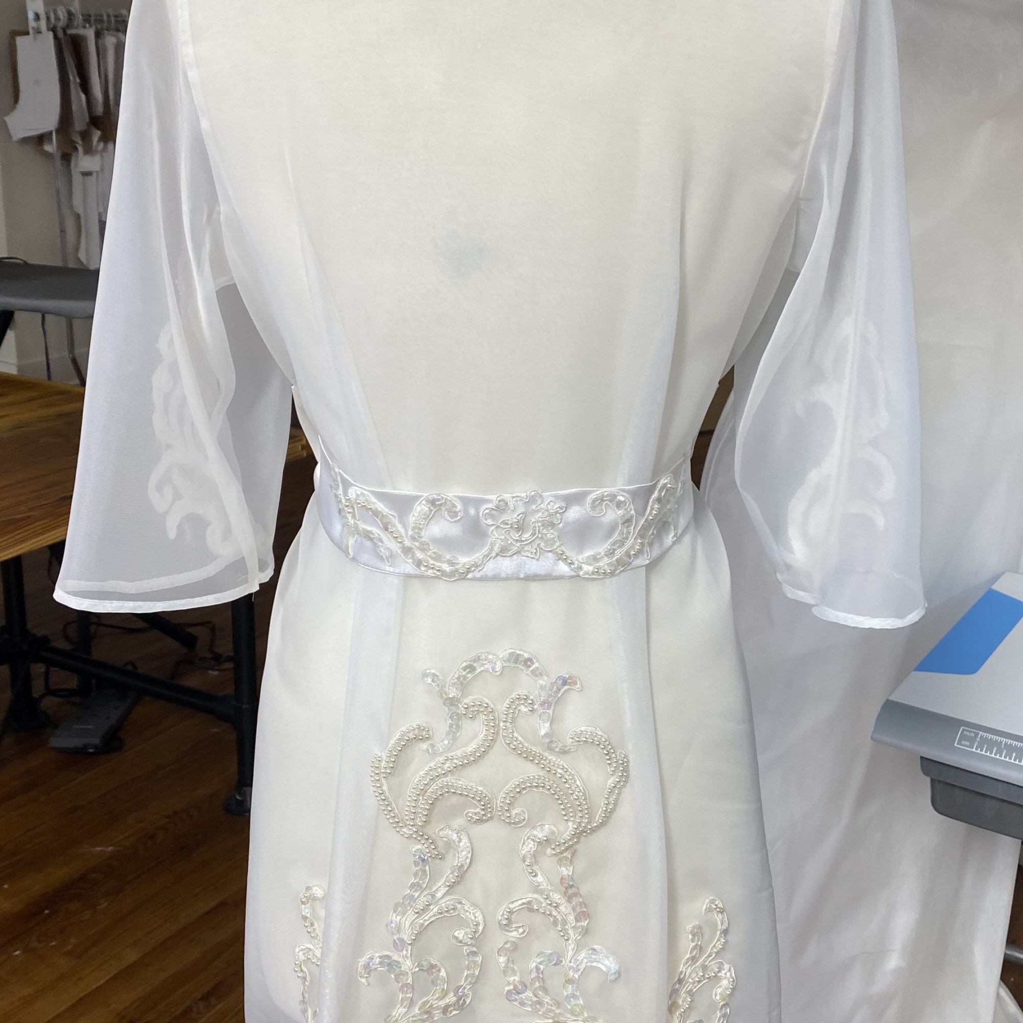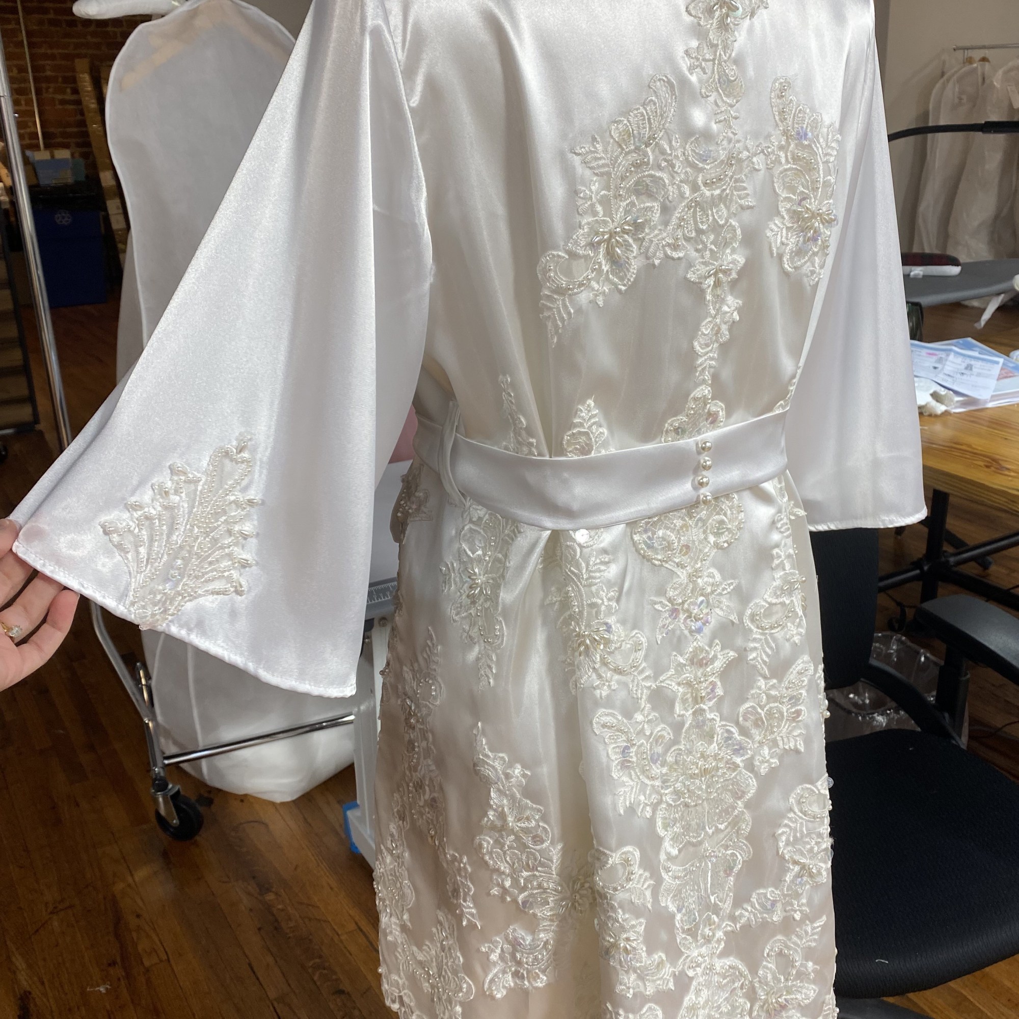 While employed at Unbox the Dress in NC i was tasked with constructing Wedding heirlooms by repurposing vintage wedding dresses. I also developed a pattern for a infant boys onesie with Velcro back opening. Most items are made use preexisting dresses made of satin and polyester blend materials. Lace detials were carefully removed from existing dresses and either hand or machine sewn back on to items.