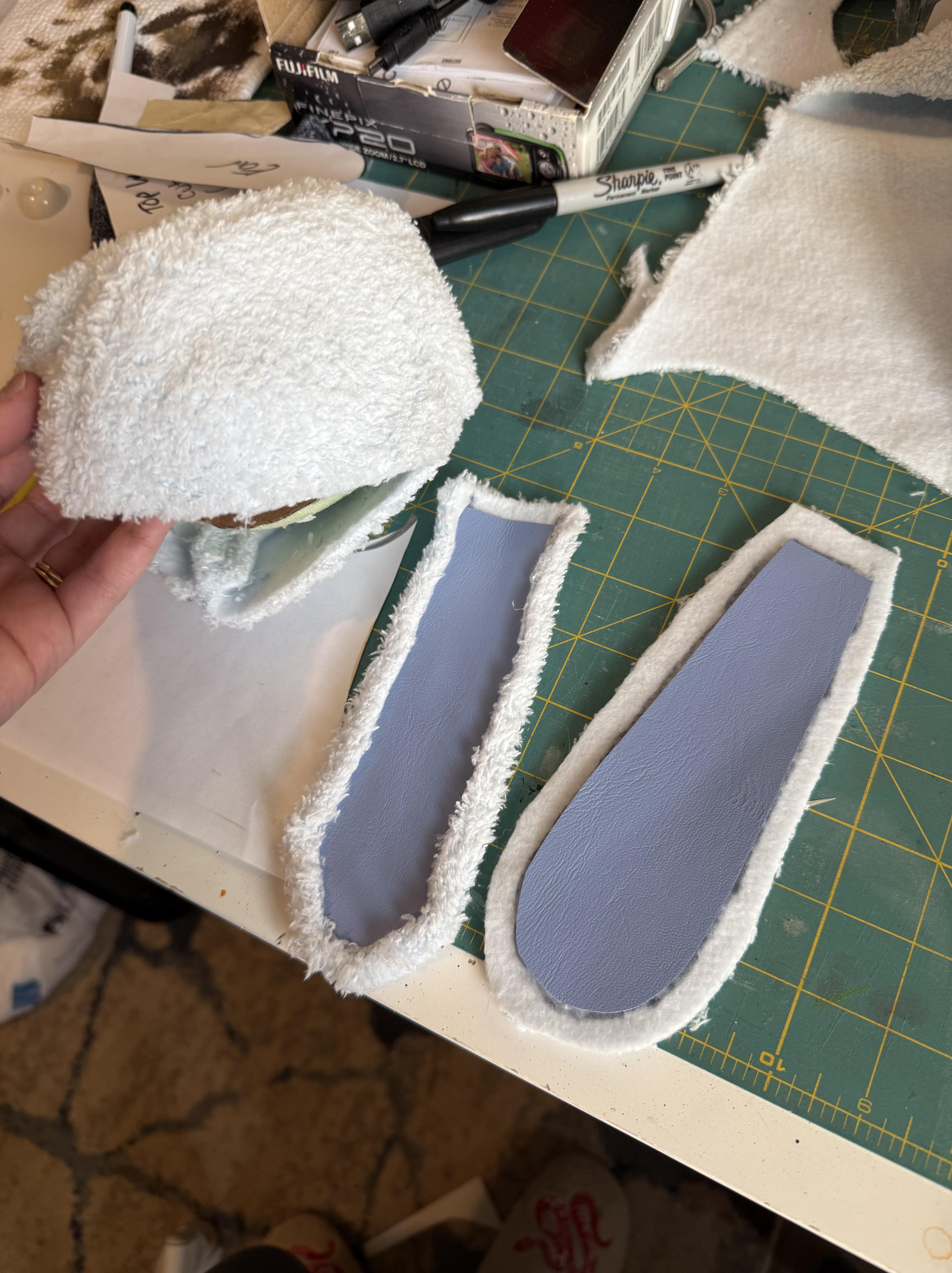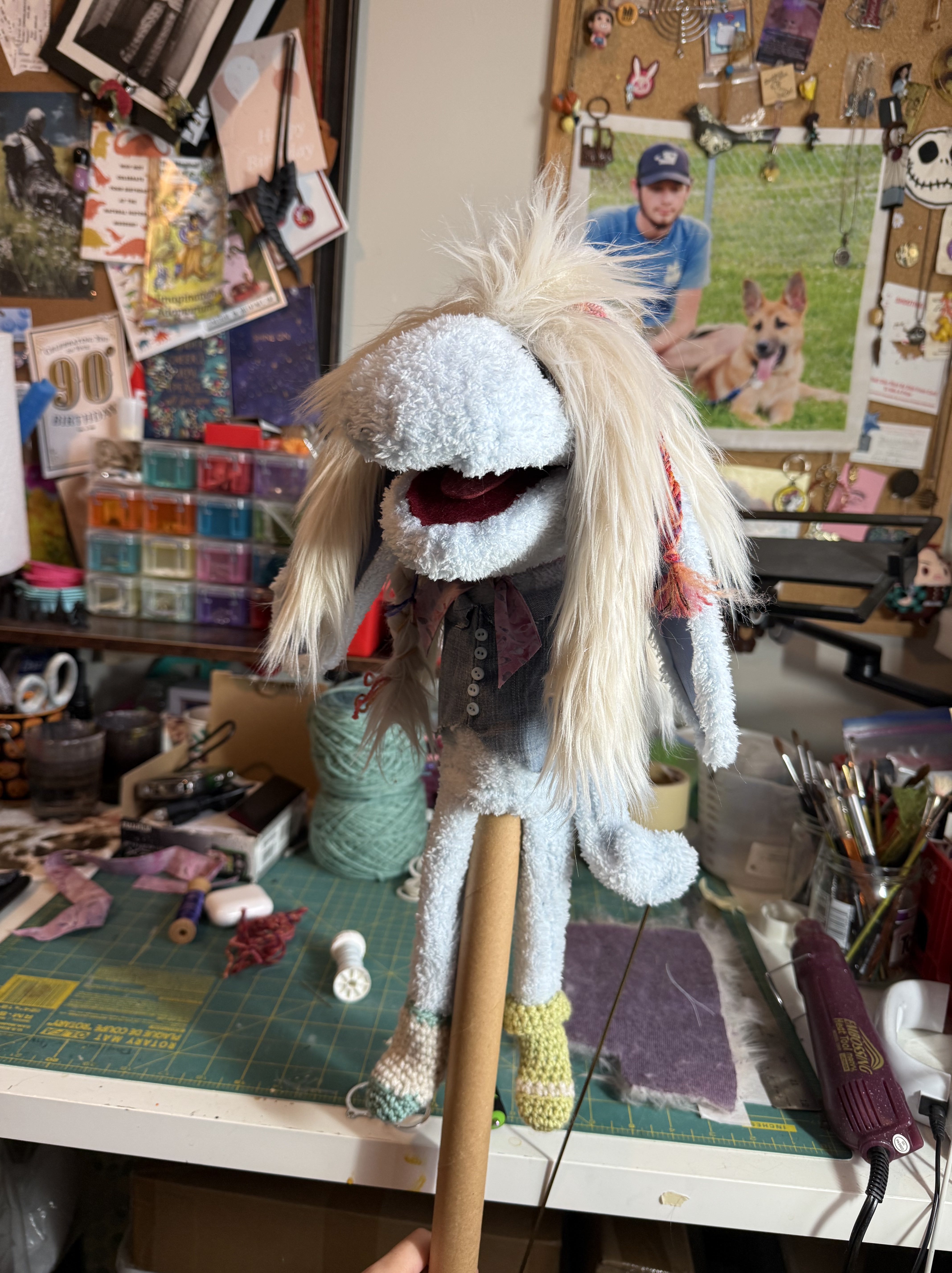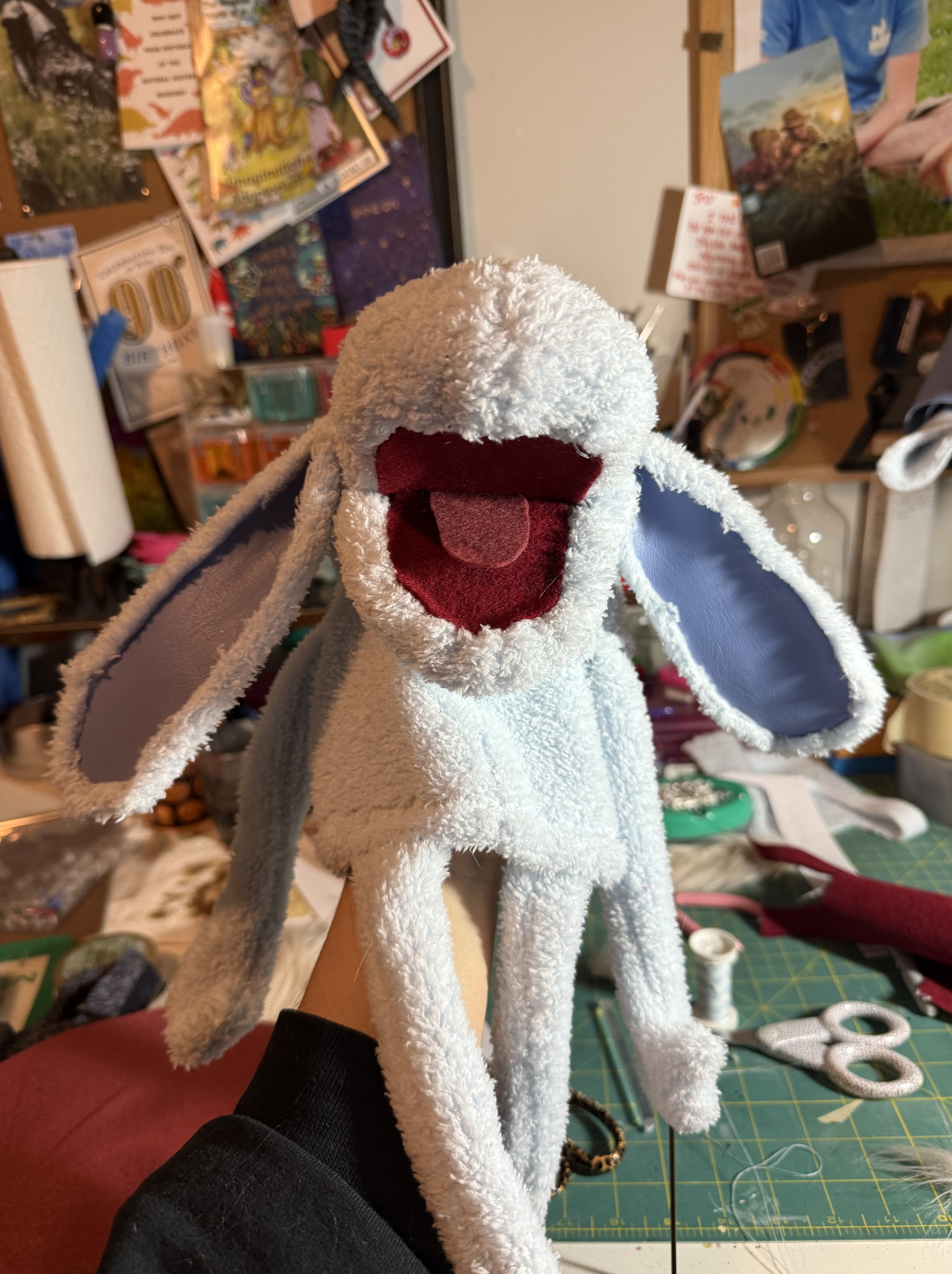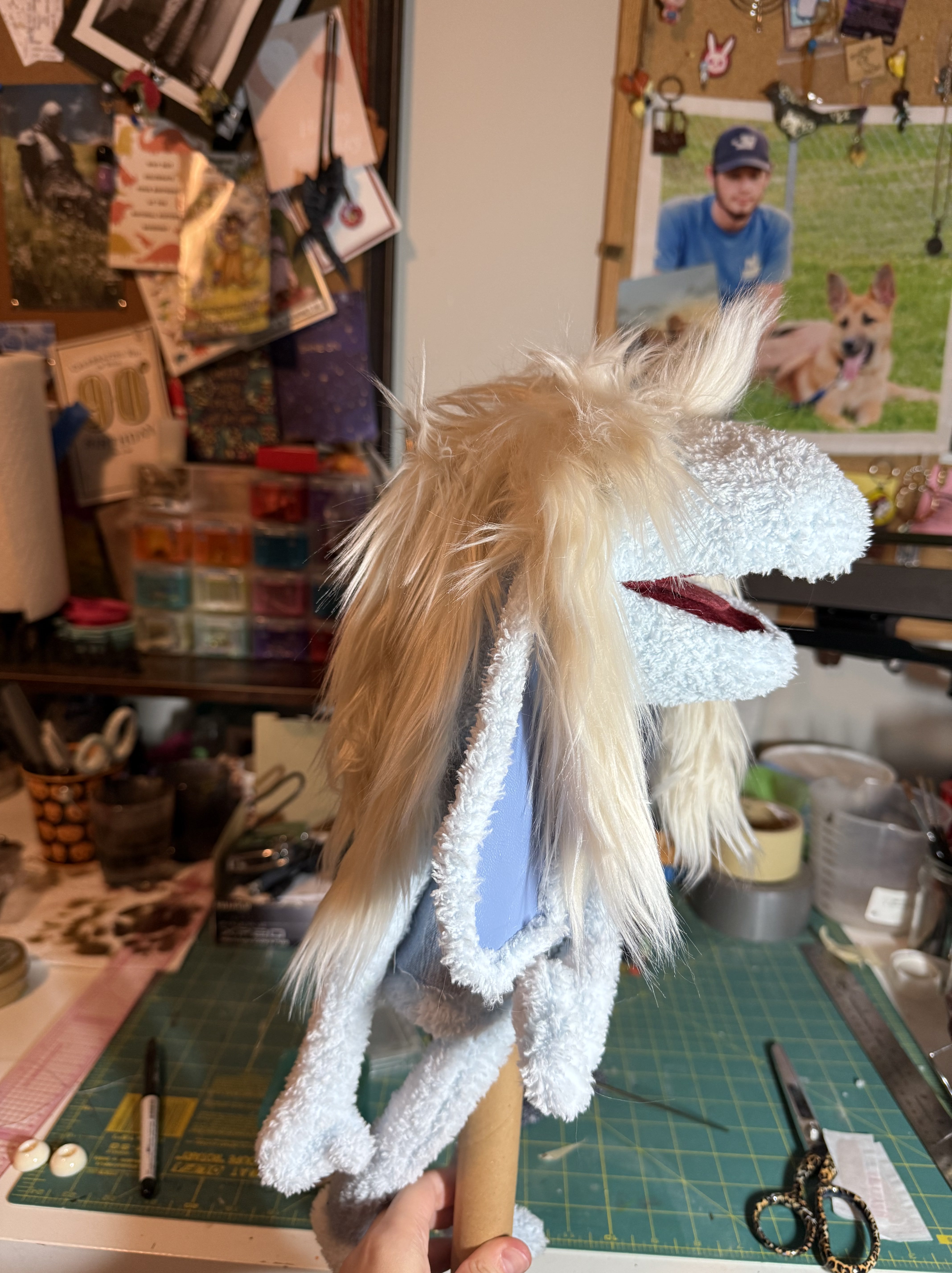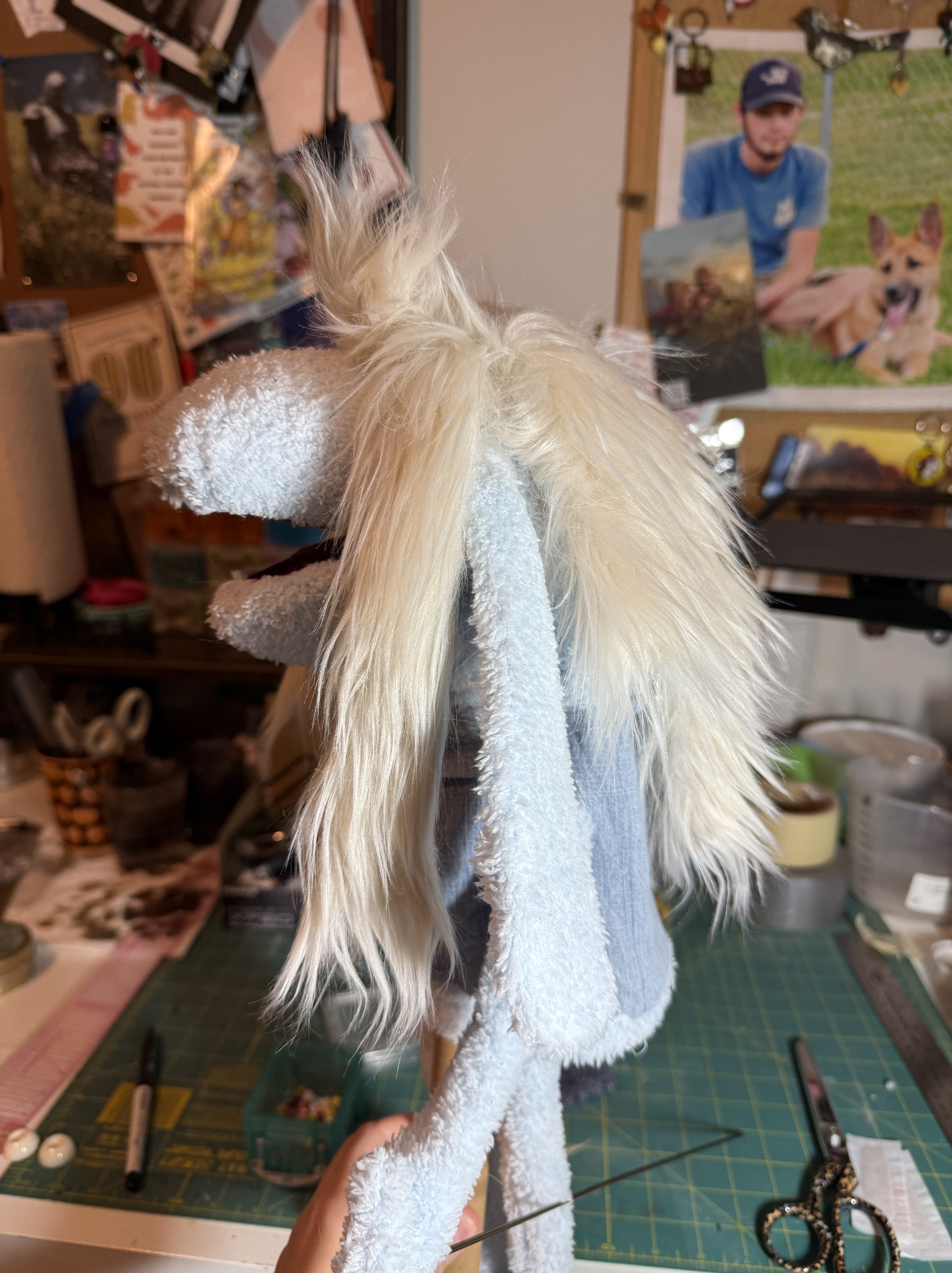 Polyester minky fabric, faux fur, upholstry foam, cardboard, wire, repurposed jean, beads, embroidery floss.