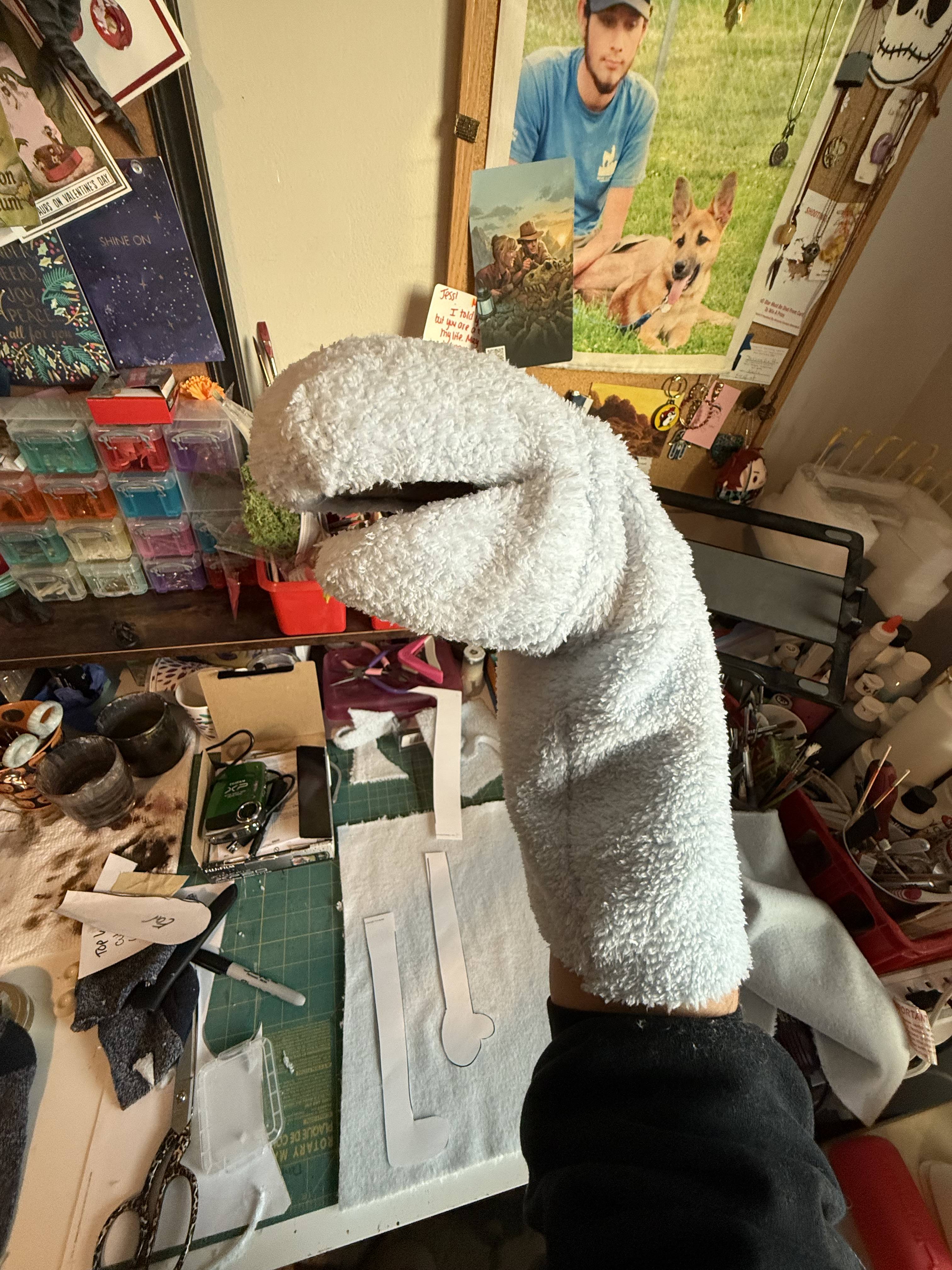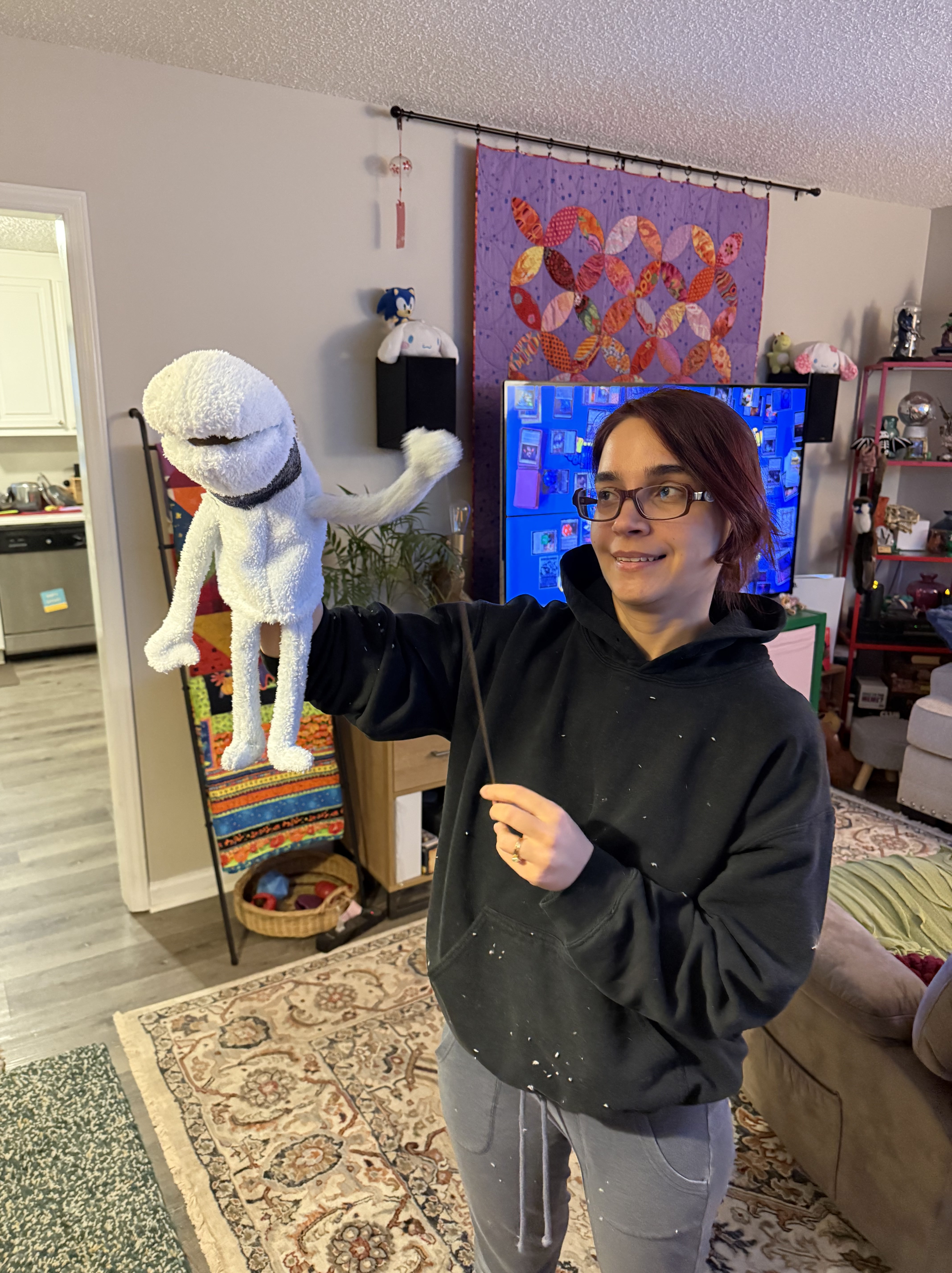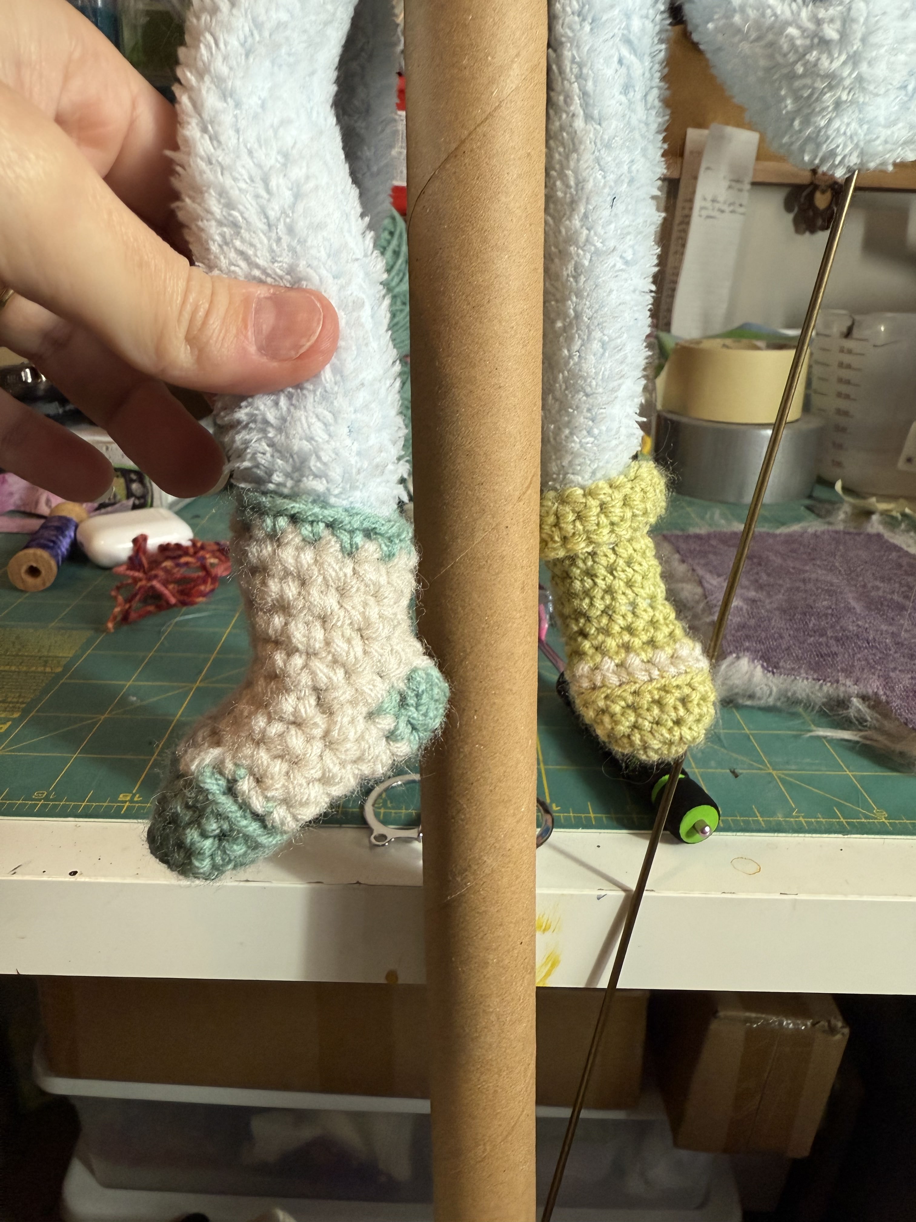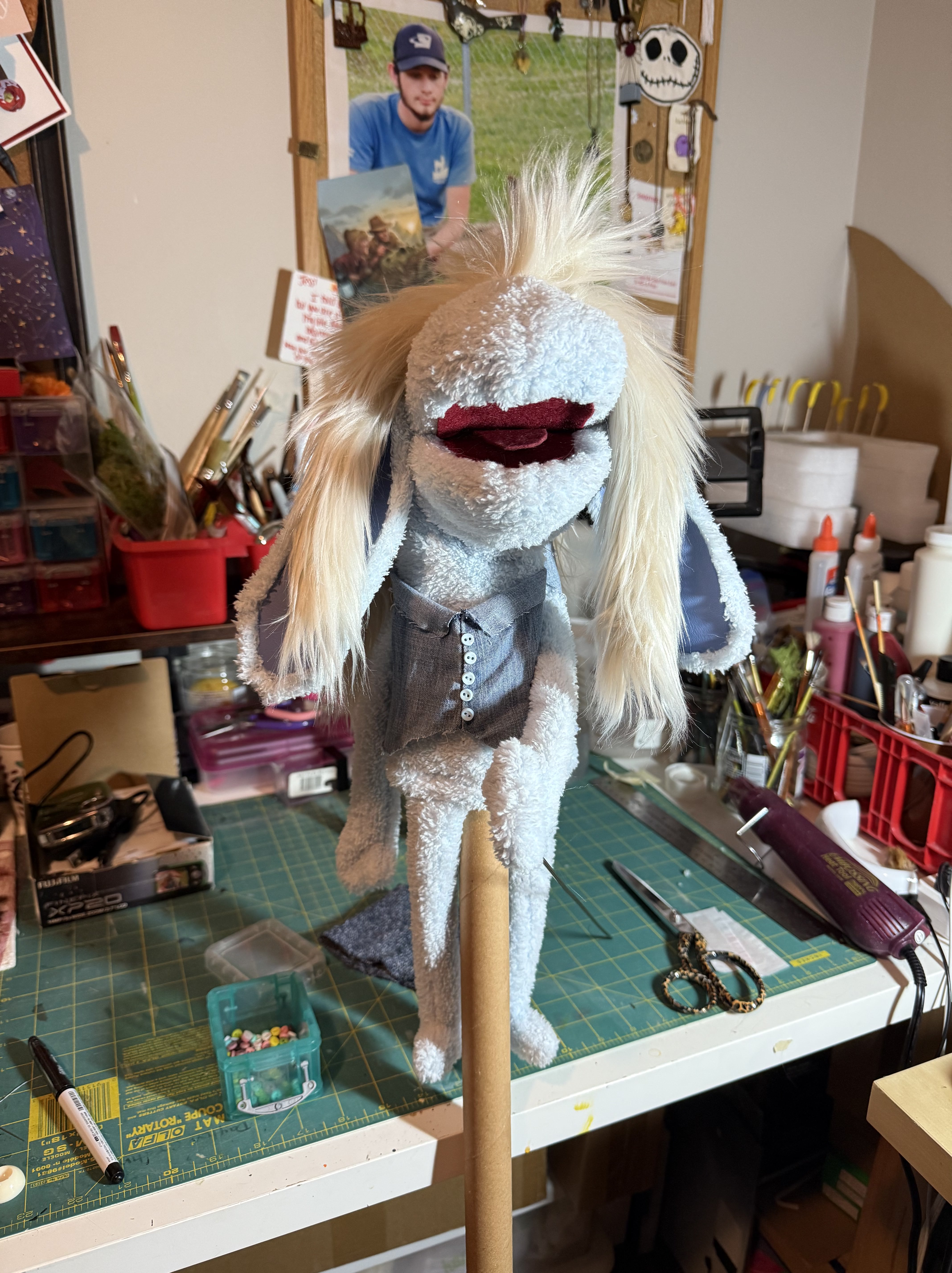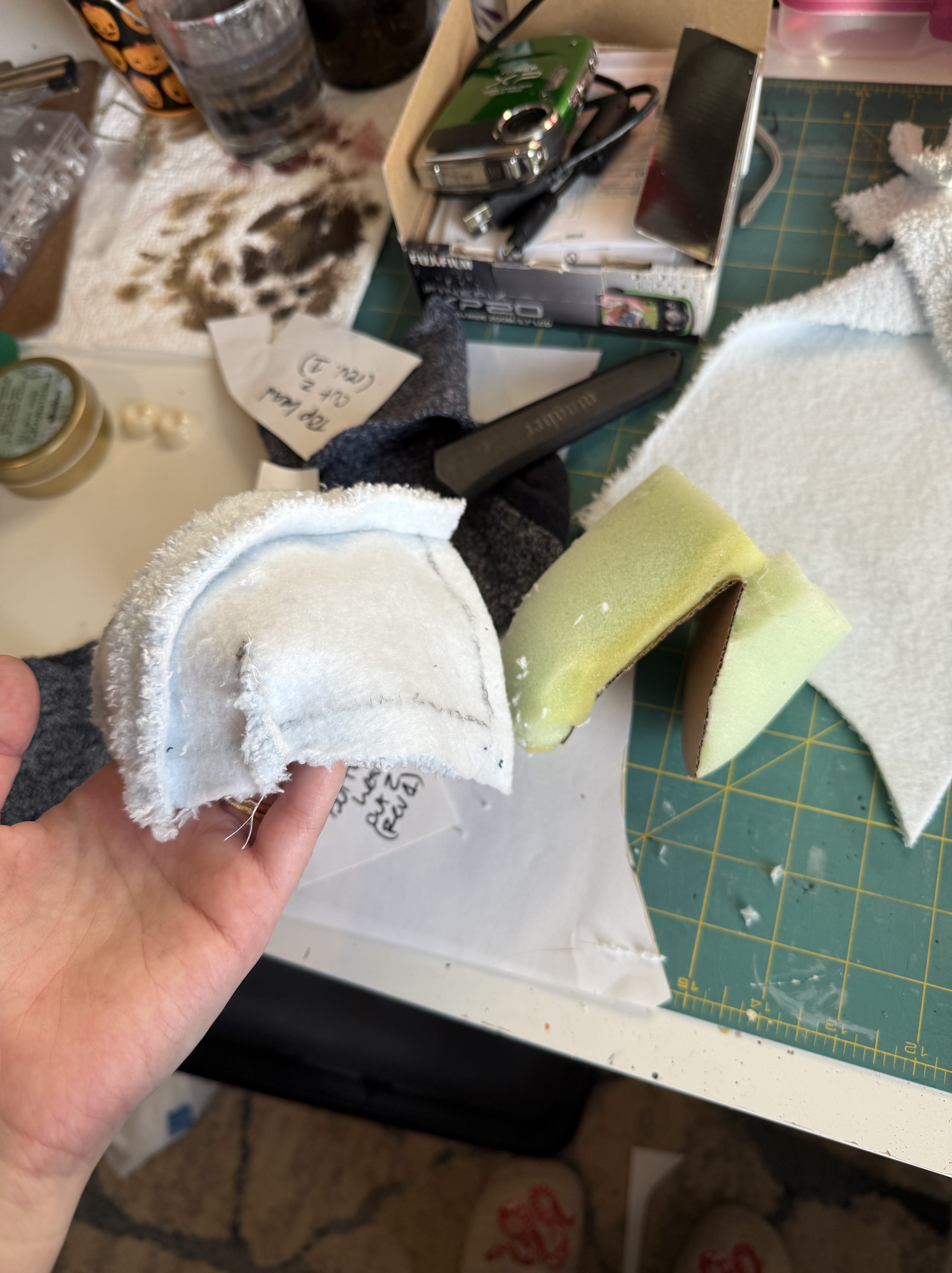 Polyester minky fabric, faux fur, upholstry foam, cardboard, wire, repurposed jean, beads, embroidery floss.