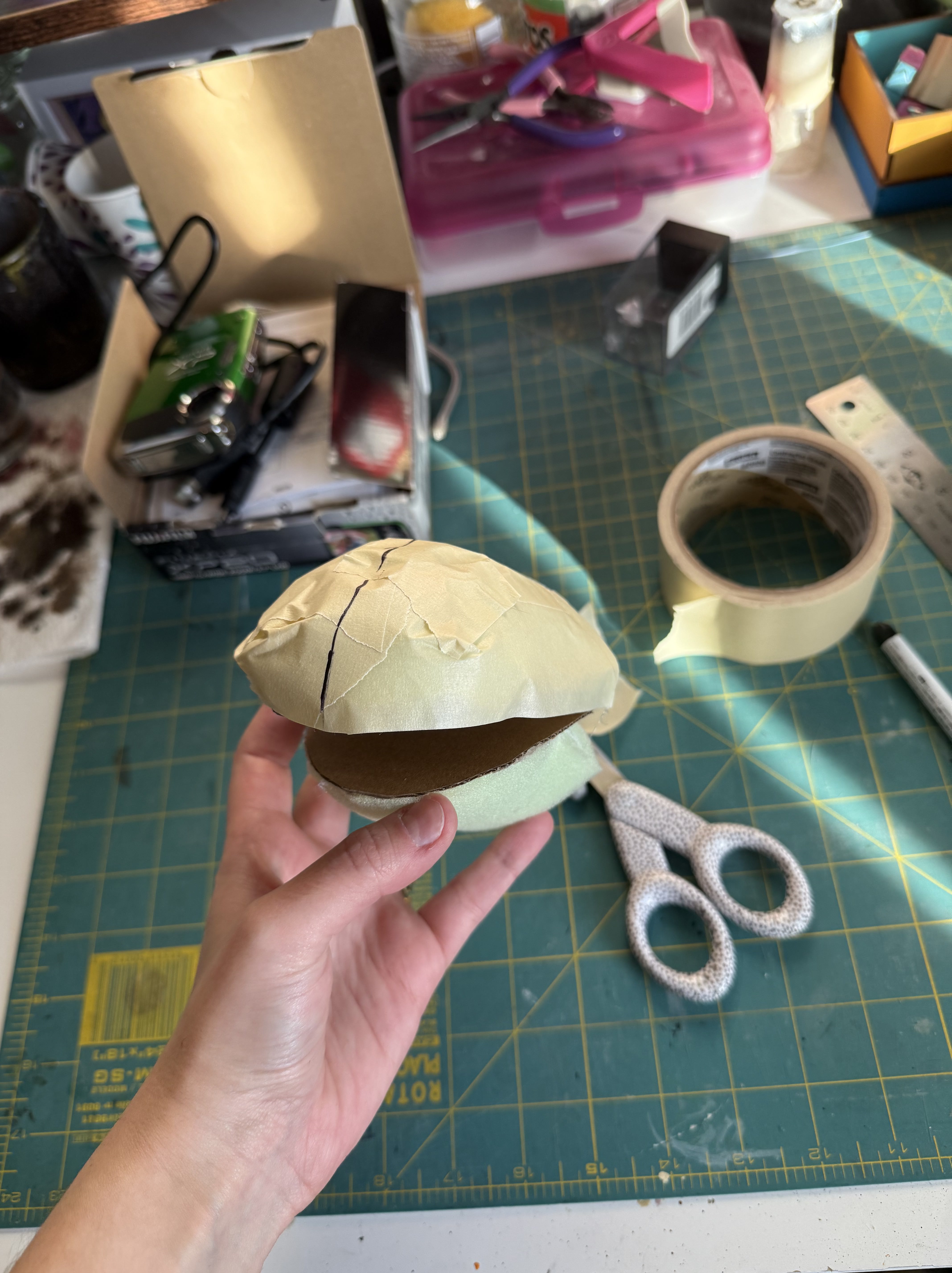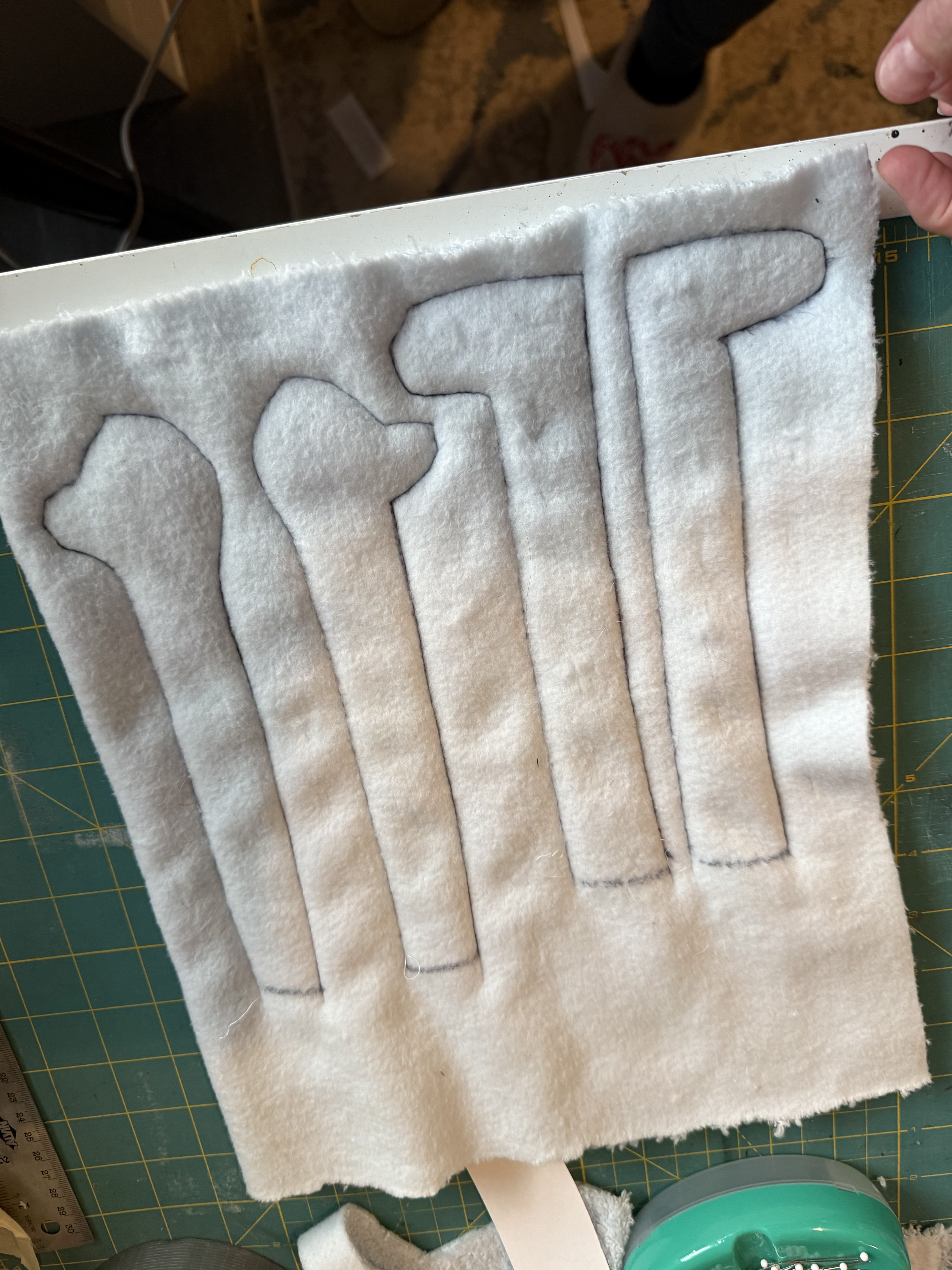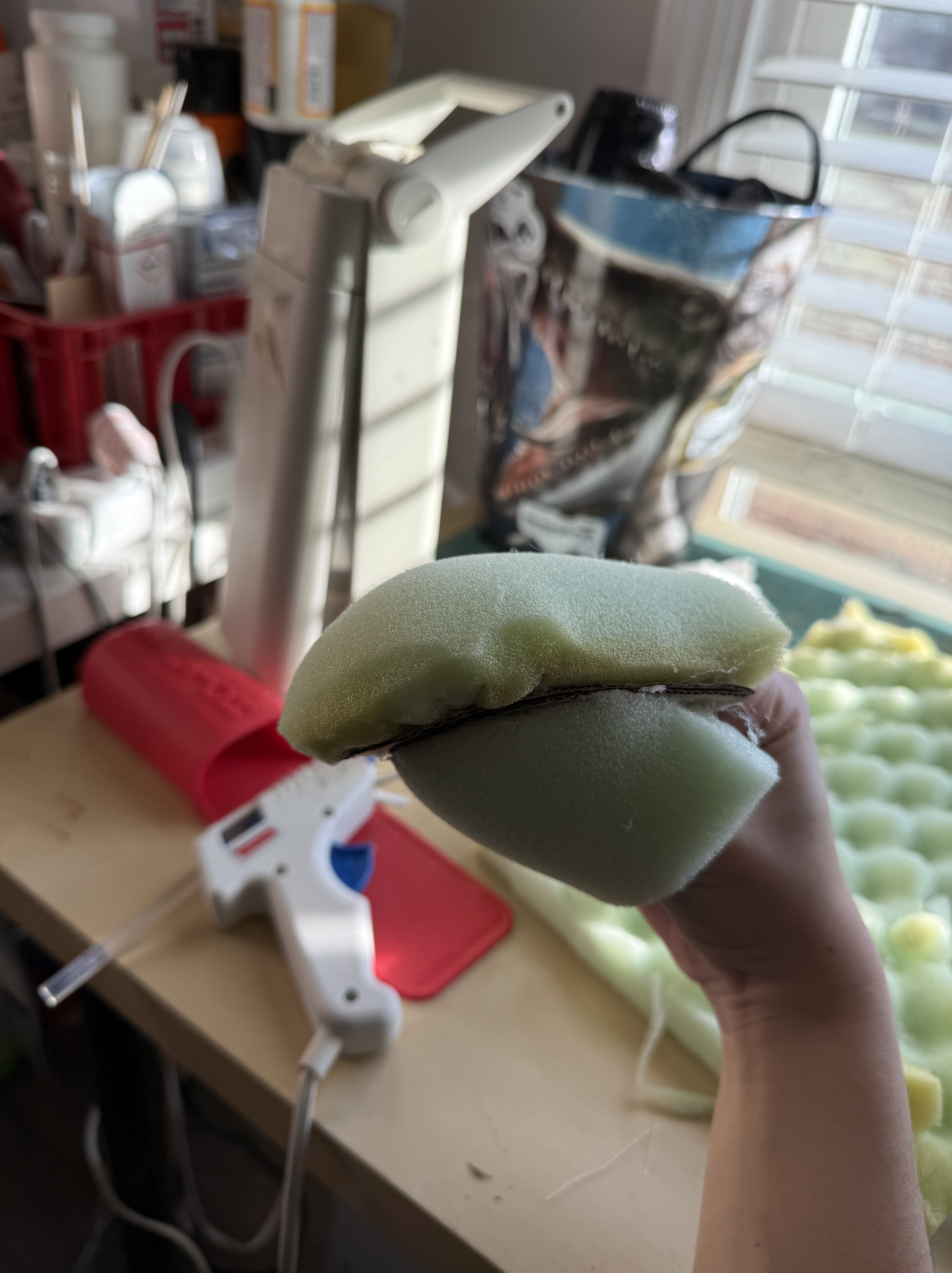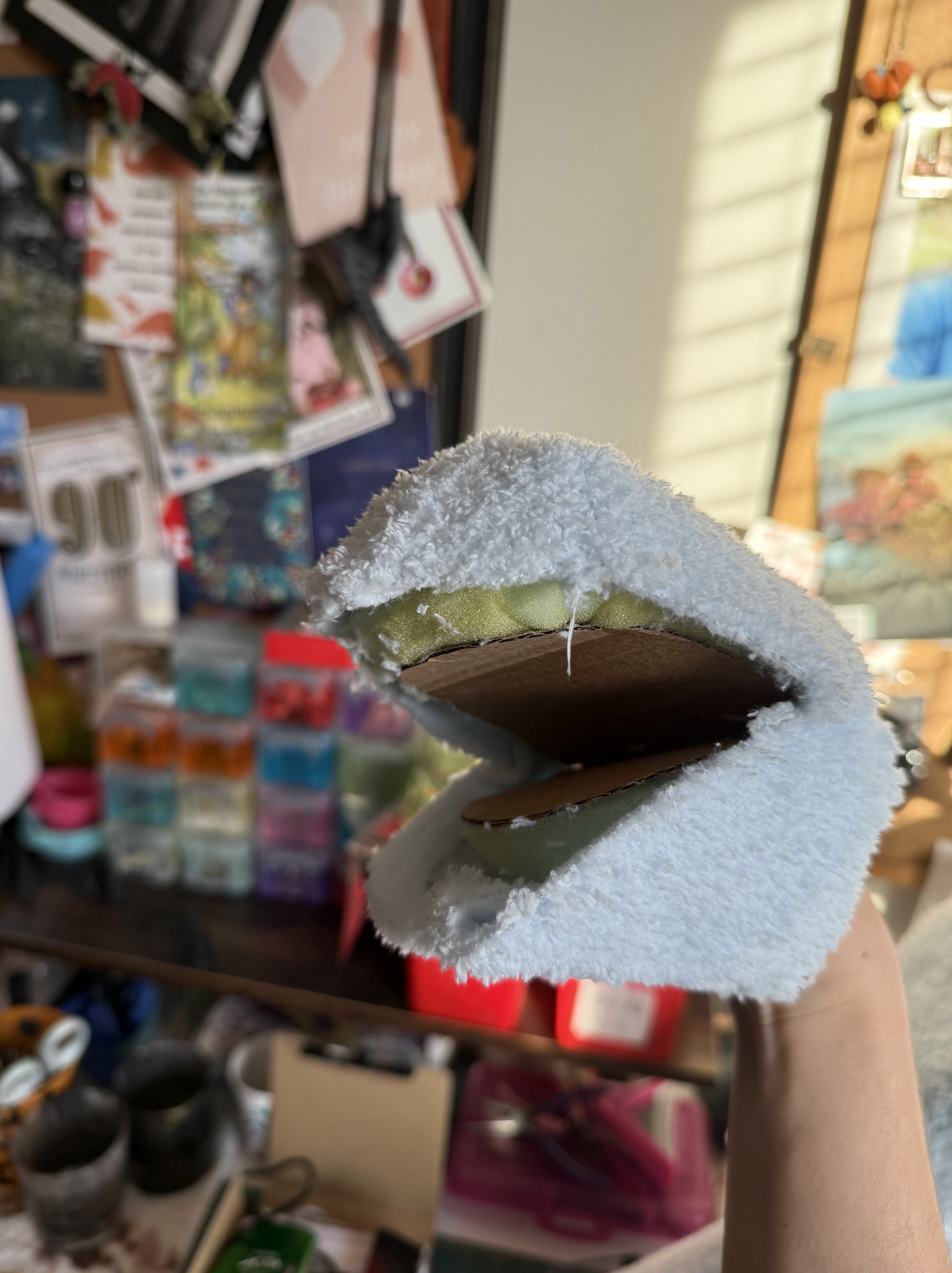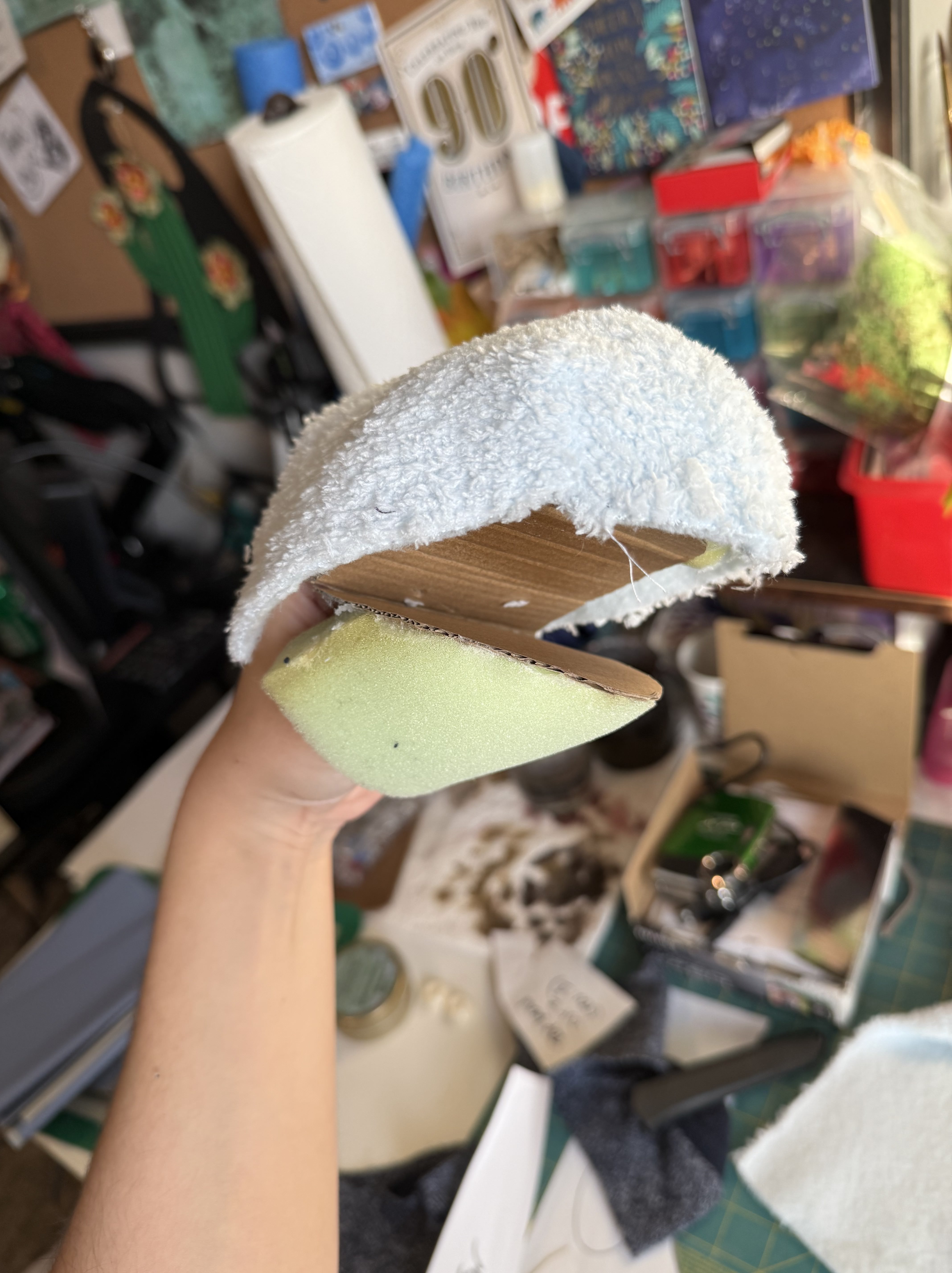 Polyester minky fabric, faux fur, upholstry foam, cardboard, wire, repurposed jean, beads, embroidery floss.